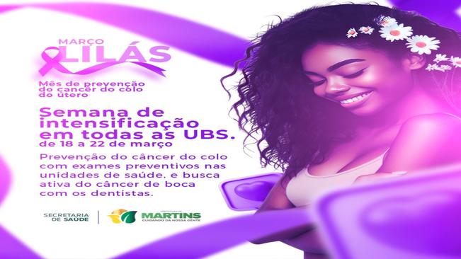 A Prefeitura de Martins, por meio da Secretaria de Saúde, do dia 18 ao dia 22/03 está realizando a semana de prevenção do câncer do colo Uterino; serão realizados exames de preventivos em todas as unidades de saúde e será feita uma busca ativa com os dentistas sobre o câncer de boca.